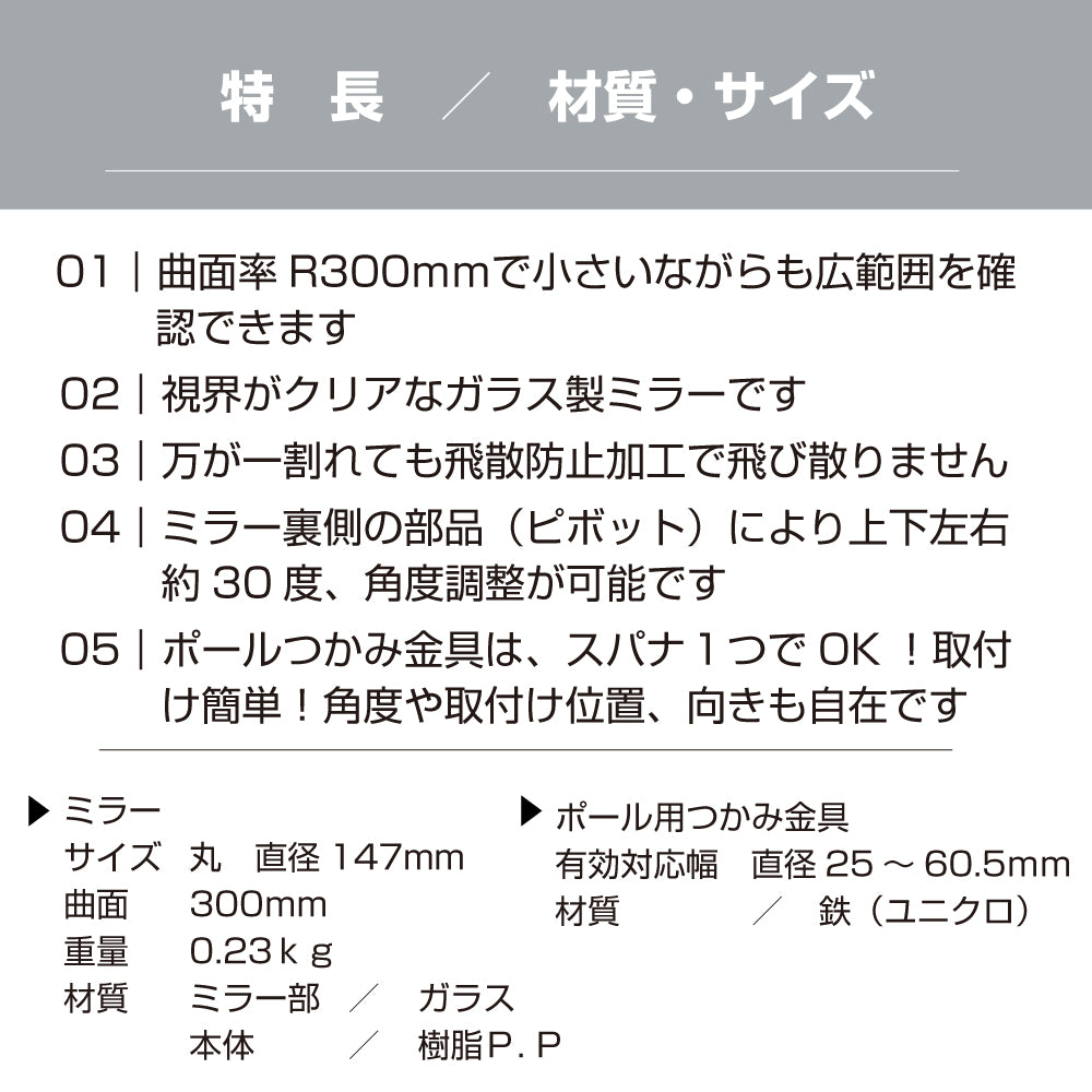 備 考 | ●日本製 ※ミラー裏側にある黒い角度調整の部品(ピボット)及びクリアの留め具は軽くて丈夫な樹脂(66ナイロン)を使用しております。(強度テスト済み) ※ポール別売りです。 |