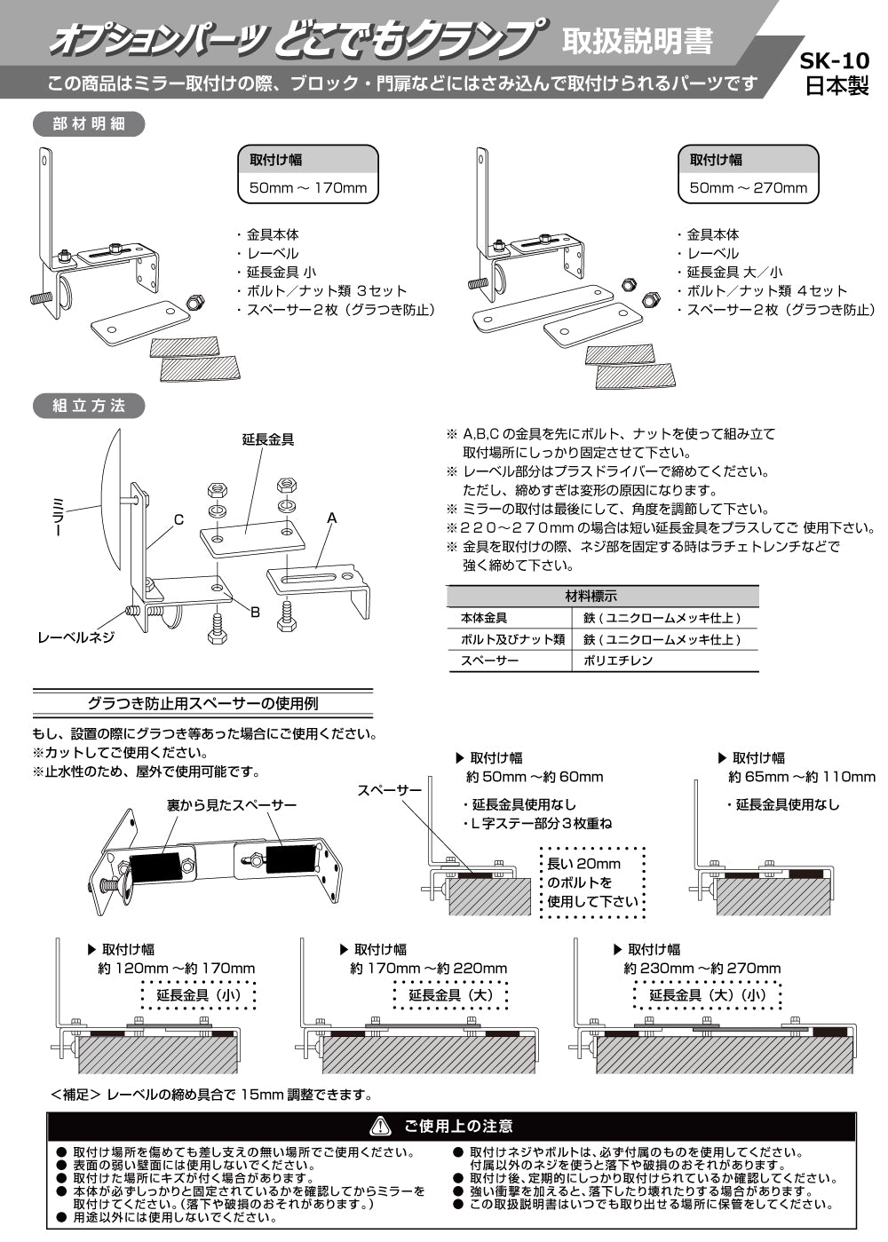 | 備 考 | ●日本製 ■使用上の注意 ● 取り付け場所を傷めても差し支えないの無い場所でご使用ください。 ● 表面の弱い壁面には使用しないでください。 ● 取り付けた場所にキズが付く場合があります。 ● 本体が必ずしっかりと固定されているかを確認してからミラーを取り付けてください。 ( 落下や破損のおそれがあります。) ● 取付けネジやボルトは、必ず付属のものを使用してください。付属以外のネジを使うと落下や破損のおそれがあります。 ● 用途以外には使用しないでください。 ● 取り付け後、定期的にしっかり取り付けられているか確認してください。 ● 強い衝撃が加わると、落下したり壊れたりする場合があります。 |