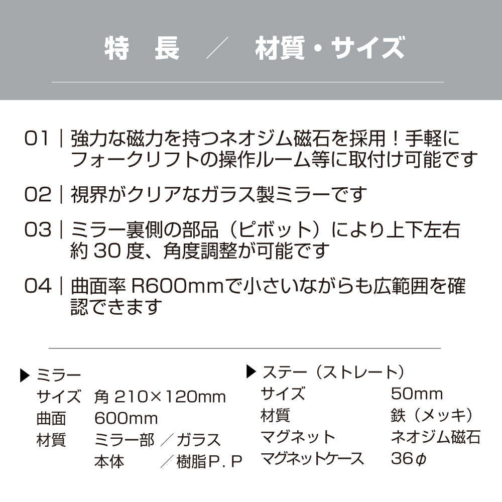 ・優れた視界: 鏡面600Rの設計により、広範囲をしっかりと確認できます。死角を減らし、安全な作業環境を提供します。